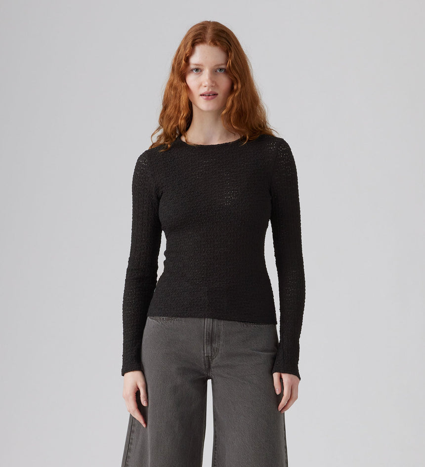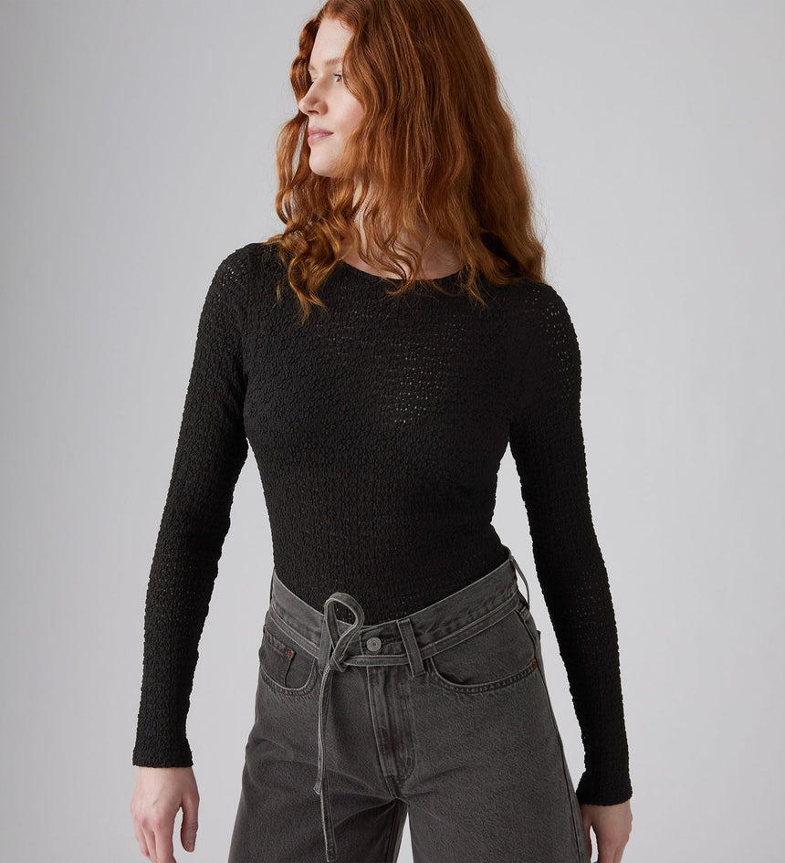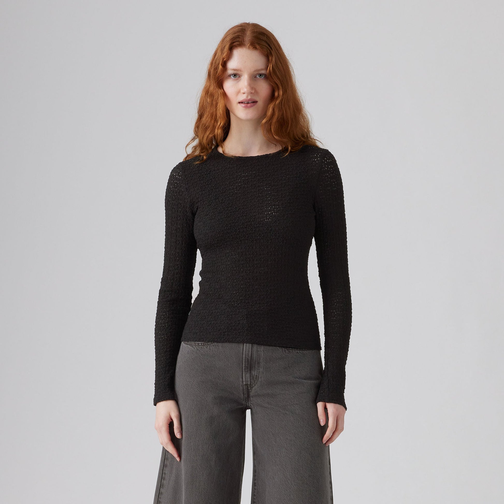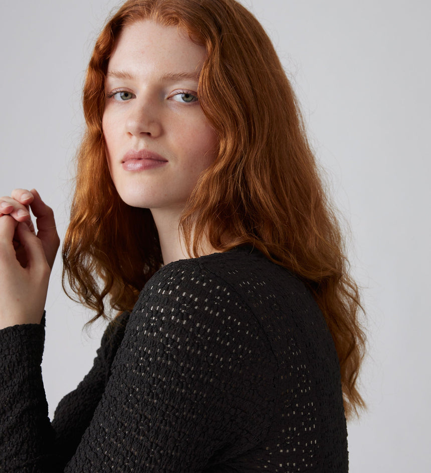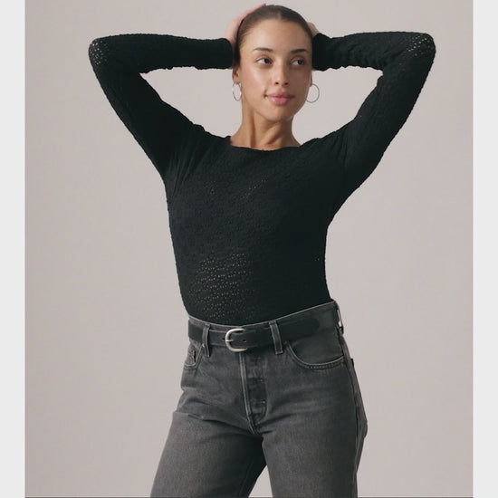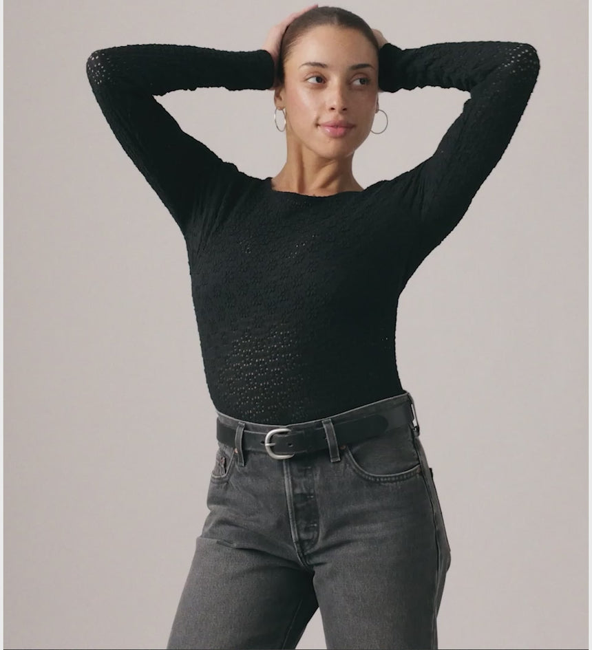 A sheer long-sleeve that isn't boring. Our Anika Crewneck Top features a high crew neckline and an ultra-flattering slim fit with a playful pattern.