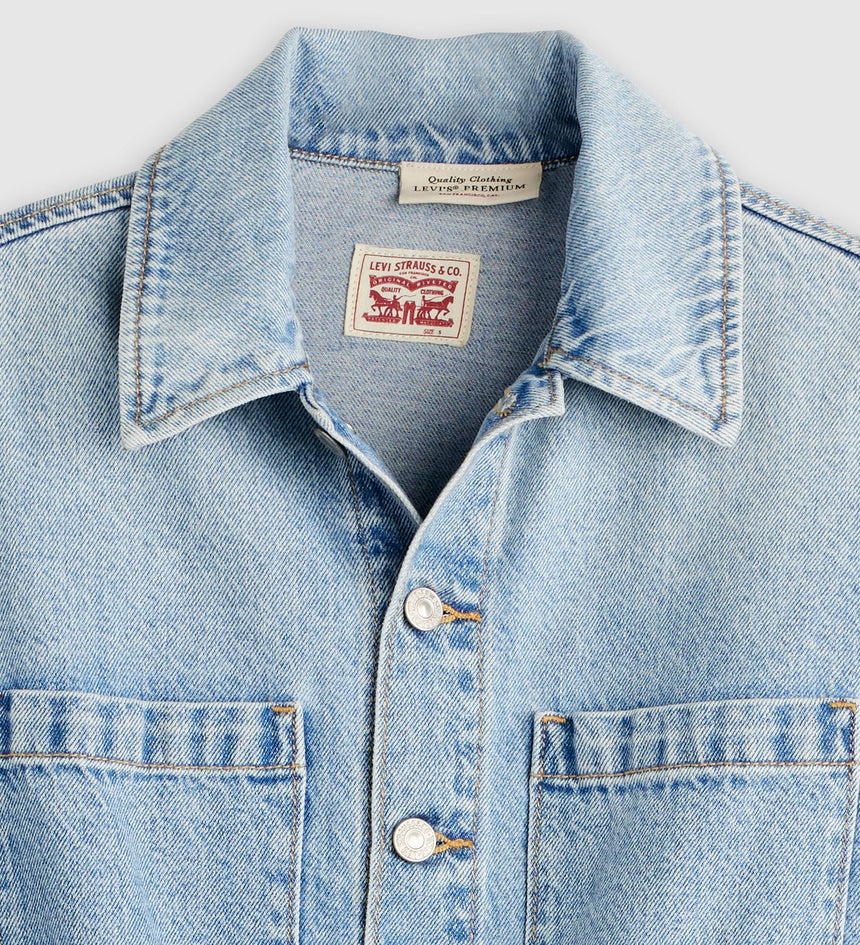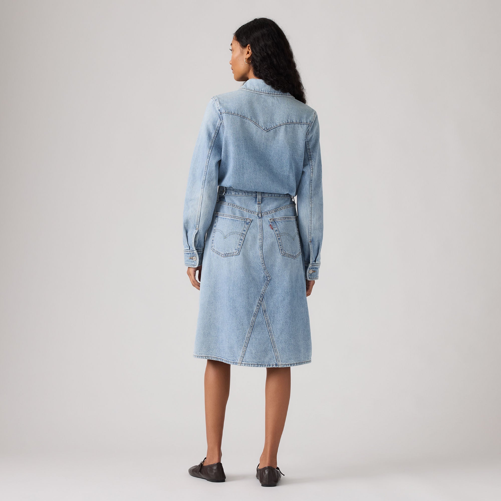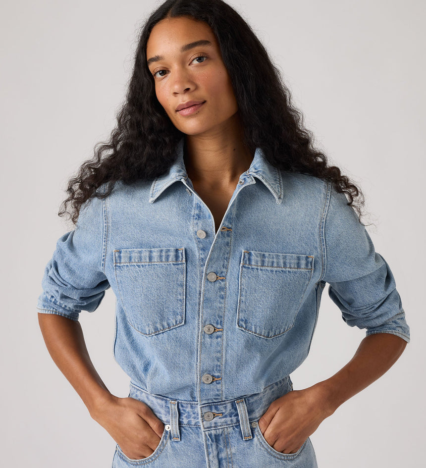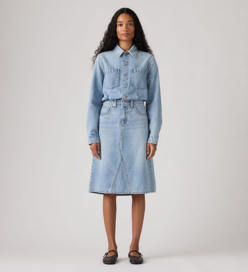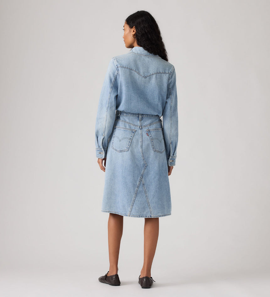 เราหยิบเสื้อเชิ้ตยีนส์คลาสสิกมาแมทช์เป็นเดรสยีนส์ทรงเอไลน์สไตล์คาวบอยตัวนี้ มีกระเป๋าหน้าอกสองข้าง กระเป๋าข้างสองข้าง และกระดุมหน้า