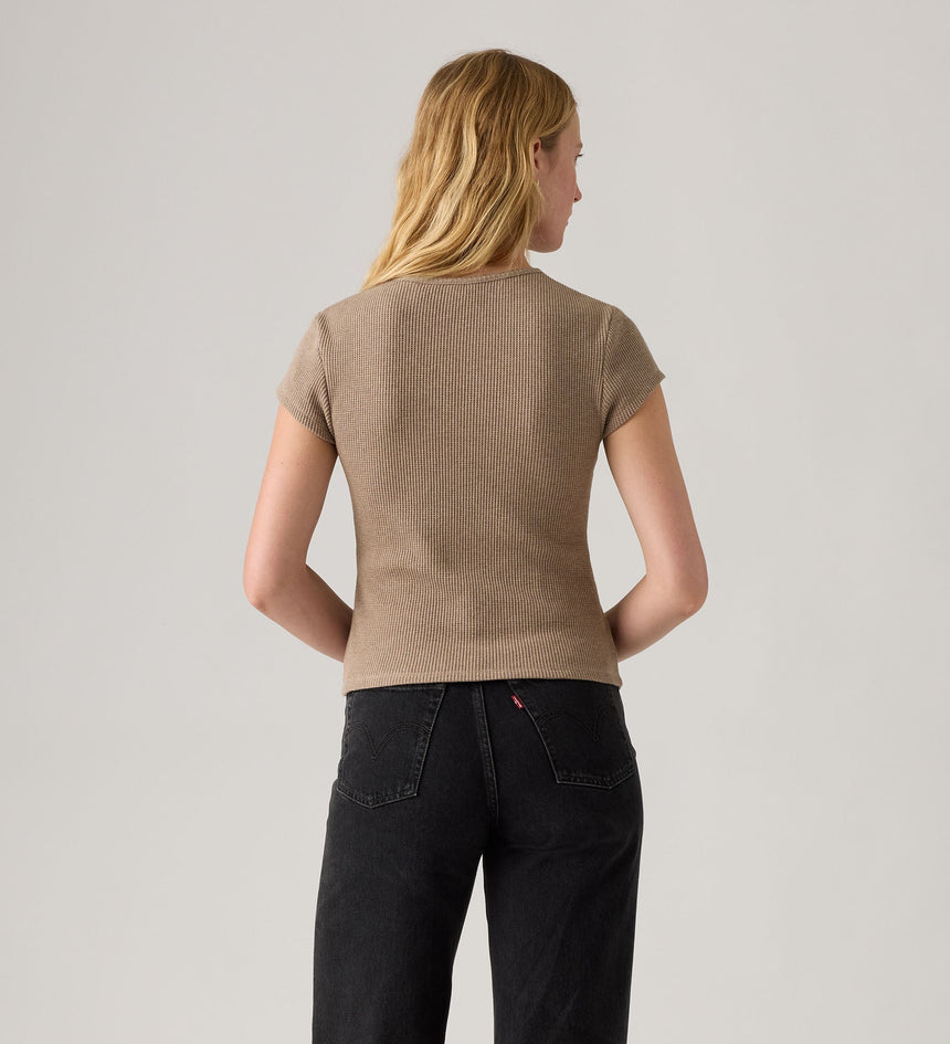 แรงบันดาลใจจากเสื้อถักชิ้นแรกๆ ที่เราเคยทำในช่วงต้นทศวรรษ 1900 เสื้อยืดแขนสั้น รุ่น Levi's® Dry Goods Waffle Cap-Sleeve Tee ได้ถูกนำกลับมาอีกครั้งในช่วงปลายทศวรรษ 1990 และตอนนี้ก็กลับมาอีกครั้ง