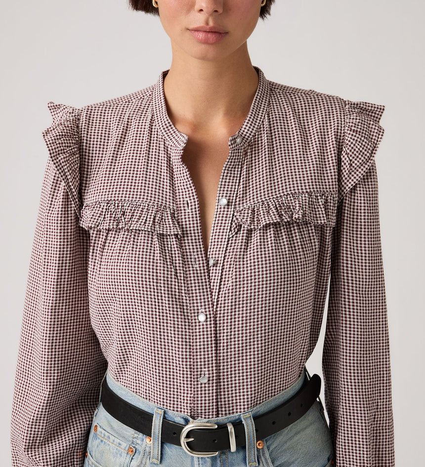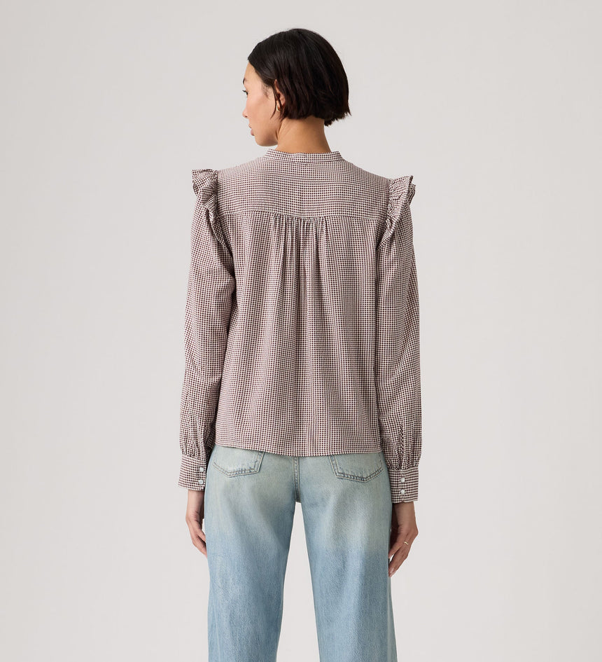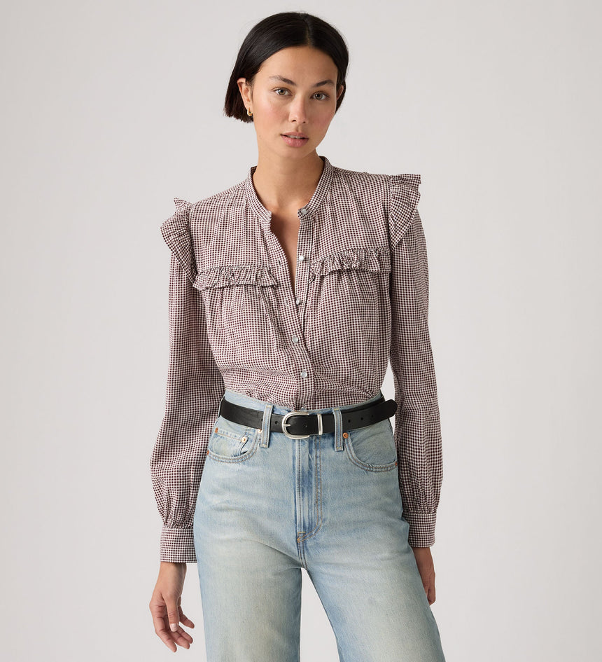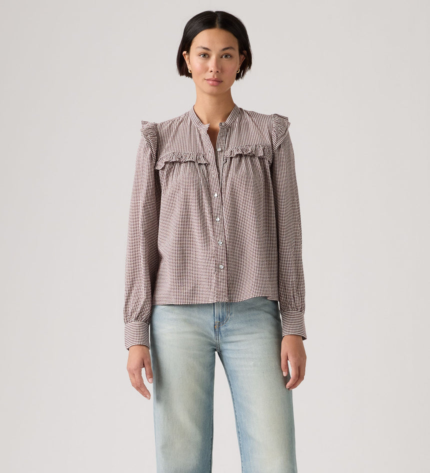 เพิ่มความพลิ้วไหวเล็กน้อยให้กับชุดของคุณ เสื้อ Gianna Long-Sleeve Blouse ของเราโดดเด่นด้วยคอเสื้อสูง, ด้านหน้าแบบติดกระดุม และทรงมาตรฐาน ทั้งหมดนี้ถูกตกแต่งด้วยขอบระบาย