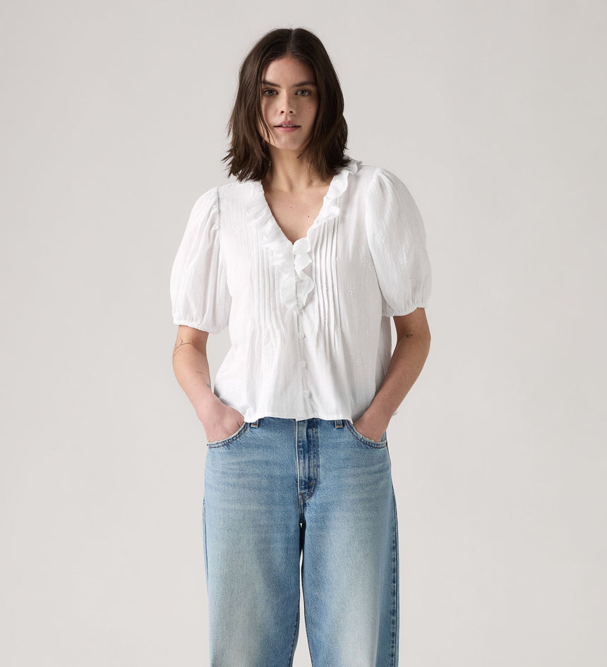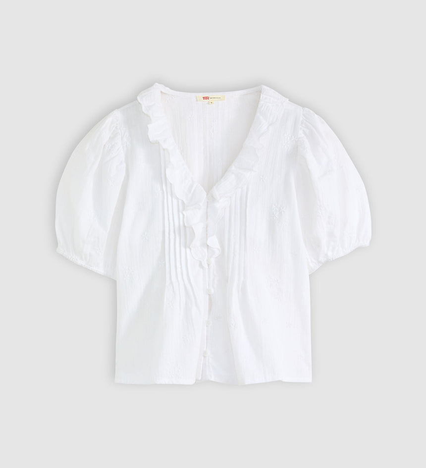 พลิ้วไหวสวยงาม ไม่ต้องวุ่นวาย เสื้อเบลาส์ Giselle Ruffle ของเรามาพร้อมกับคอเสื้อแบบตักที่นุ่มนวลพร้อมดีเทลระบาย กระดุมด้านหน้า และทรงมาตรฐานที่ใส่สบาย