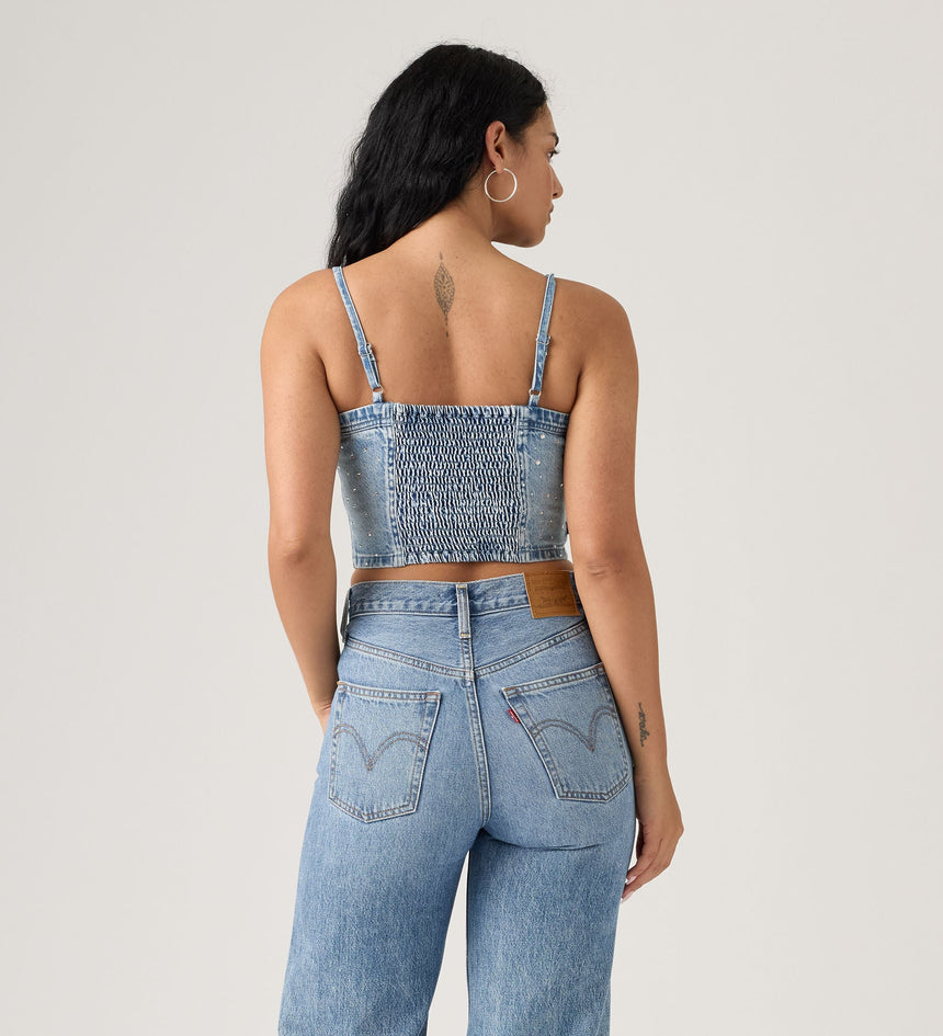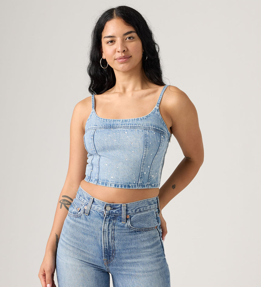 เสื้อสายเดี่ยวไม่มีวันตกยุค Jadine Denim Cami Tank ของเรามาพร้อมคอ scoop ที่สวยงาม สายปรับได้ และทรงครอปเข้ารูปสุดปัง